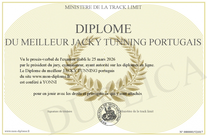 Envoyez par email votre Diplôme du meilleur JACKY TUNNING portugais personalisé