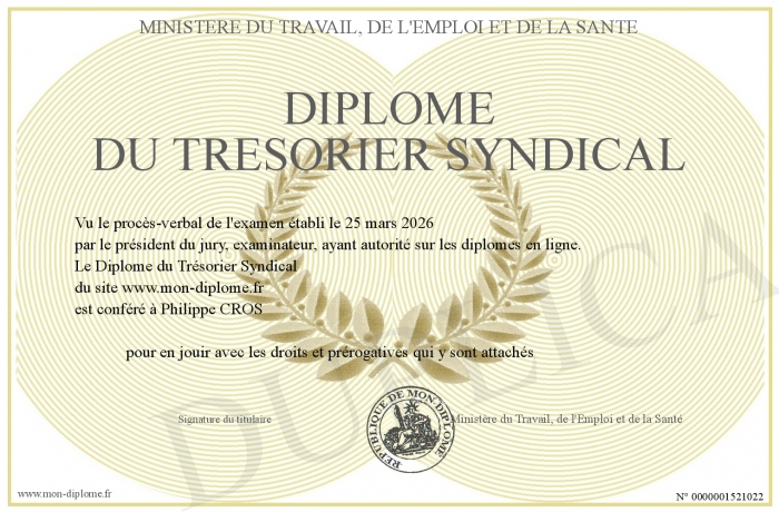 Envoyez par email votre Diplôme du Trésorier Syndical personalisé