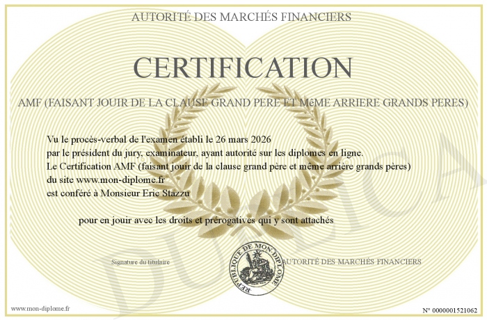 Envoyez par email votre Certification AMF (faisant jouir de la clause grand père et même arrière grands pères) personalisé