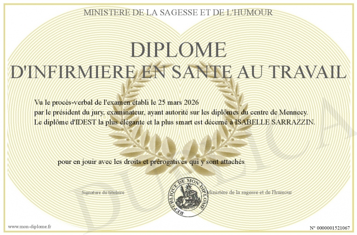 Envoyez par email votre Diplôme d'infirmière en santé au travail personalisé