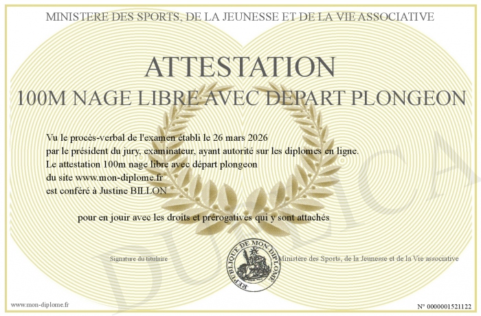 Envoyez par email votre attestation 100m nage libre avec départ plongeon personalisé
