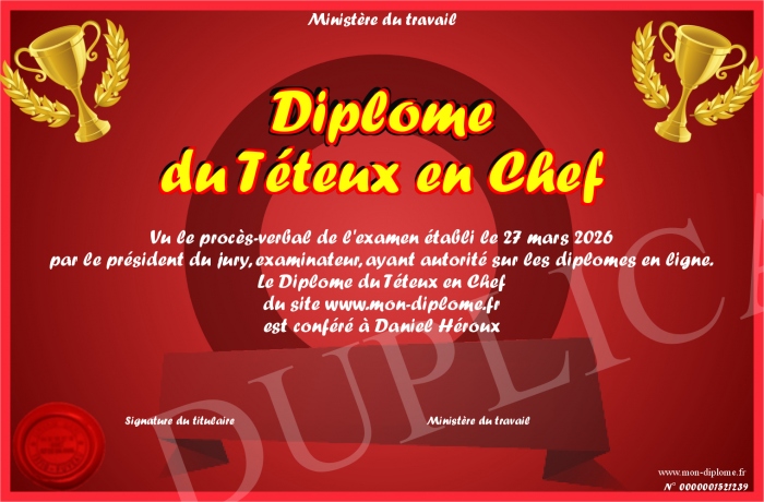 Envoyez par email votre Diplôme du Téteux en Chef personalisé