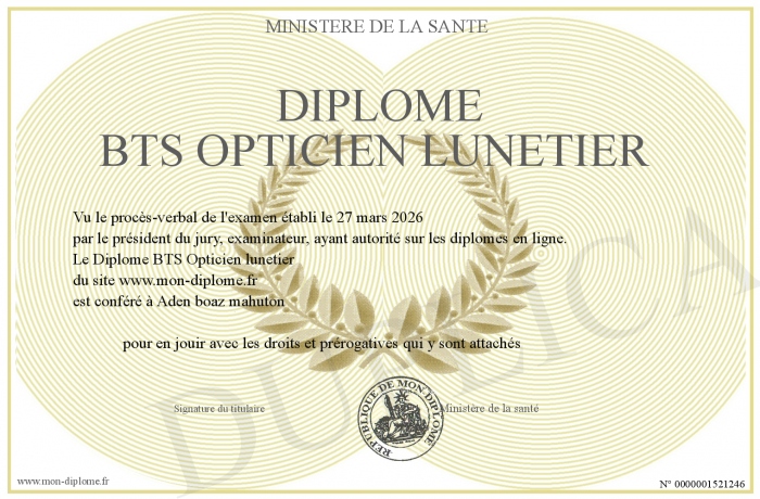 Envoyez par email votre Diplôme BTS Opticien lunetier personalisé