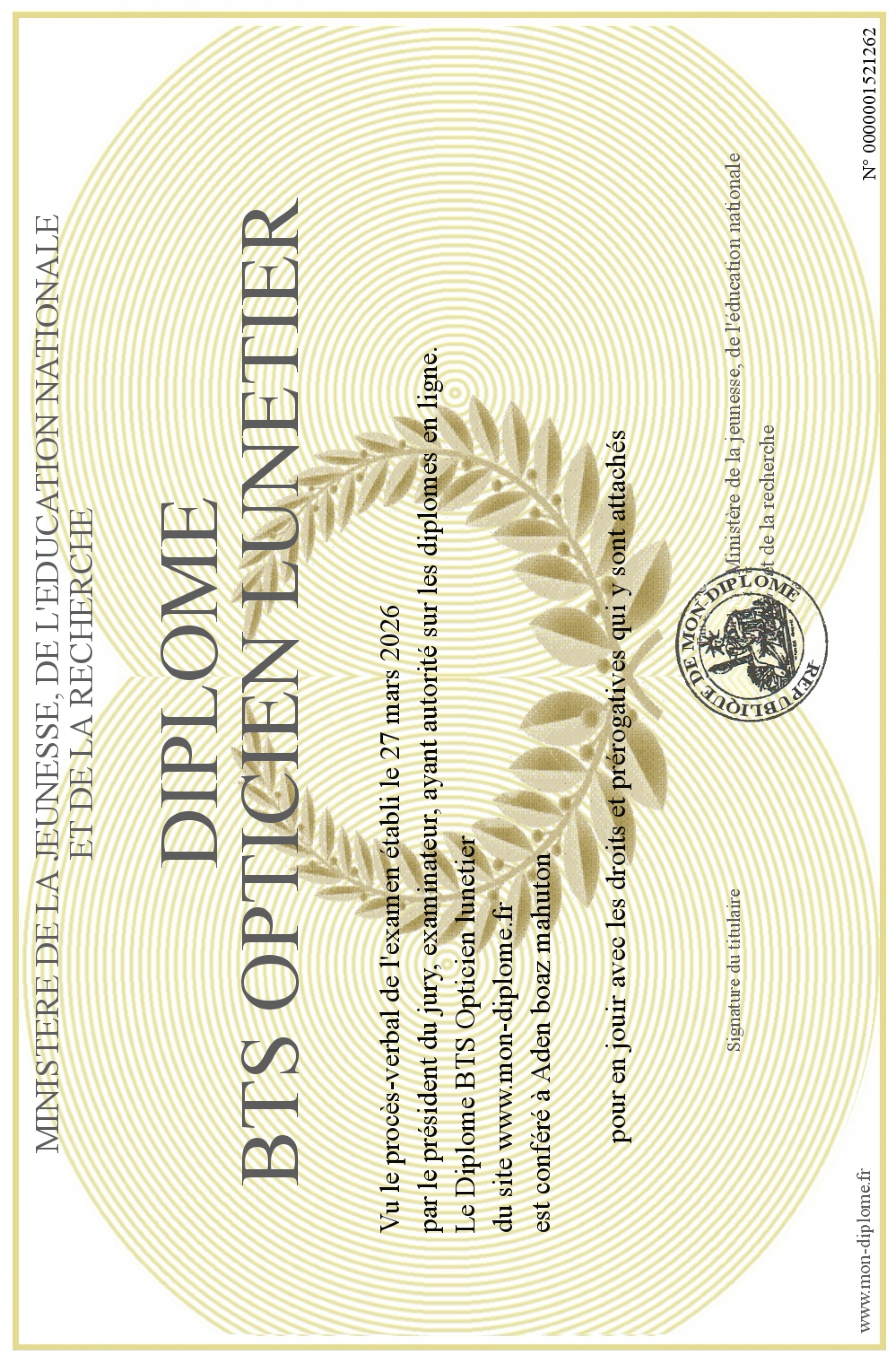 Envoyez par email votre Diplôme BTS Opticien lunetier personalisé