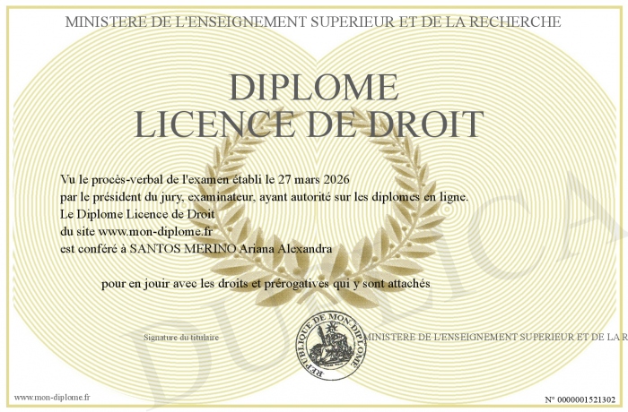 Envoyez par email votre Diplôme Licence de Droit personalisé