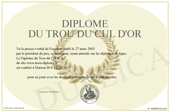 Envoyez par email votre Diplôme du Trou du Cul d'Or personalisé