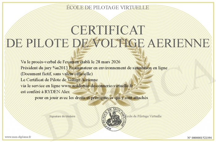 Envoyez par email votre Certificat de Pilote de Voltige Aérienne personalisé