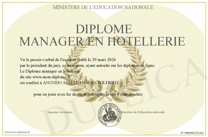 Envoyez par email votre Diplôme manager en hôtellerie personalisé
