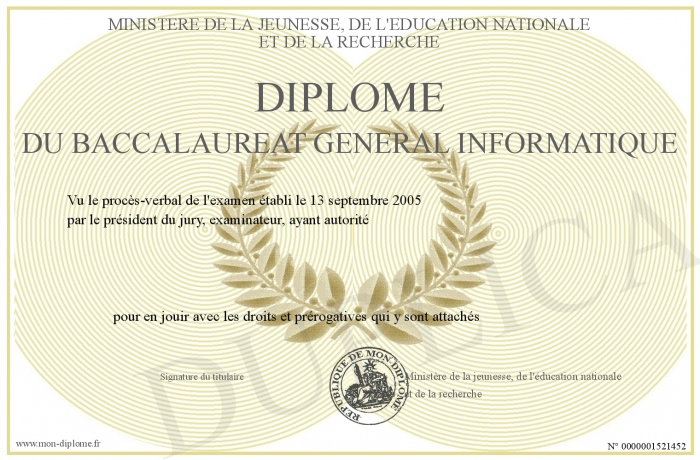 Envoyez par email votre Diplôme du baccalaureat général INFORMATIQUE personalisé