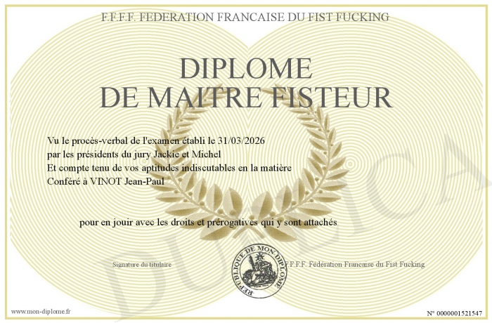 Envoyez par email votre Diplôme de Maitre Fisteur personalisé