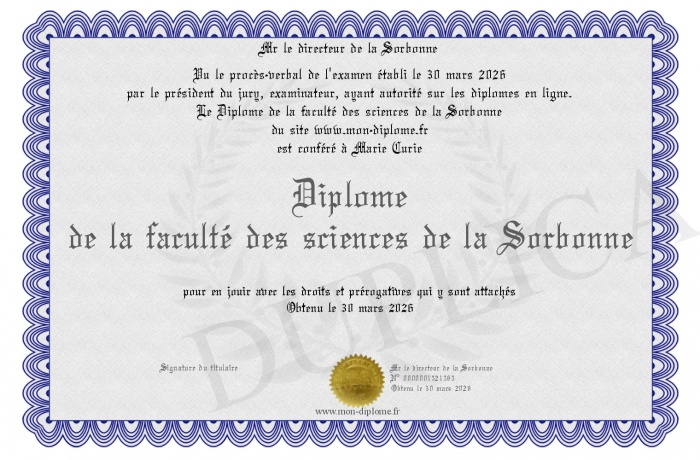 Envoyez par email votre Diplôme de la faculté des sciences de la Sorbonne personalisé