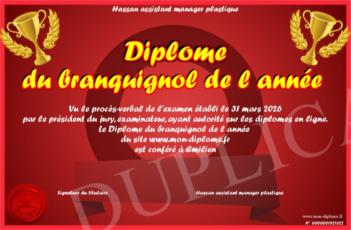 Envoyez par email votre Diplôme du branquignol de l année personalisé