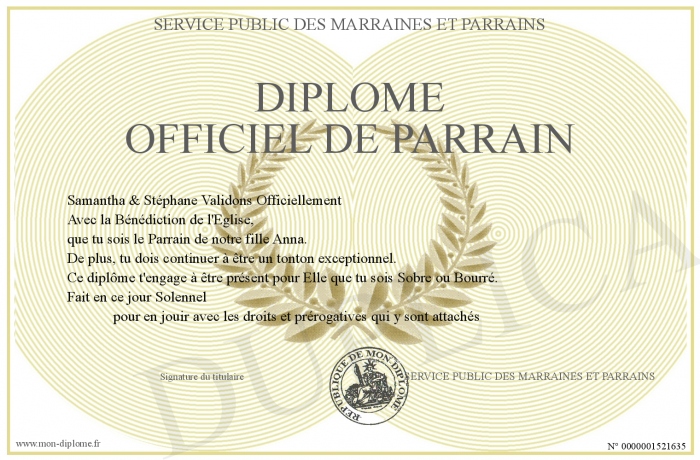 Envoyez par email votre DIPLOME OFFICIEL DE PARRAIN personalisé