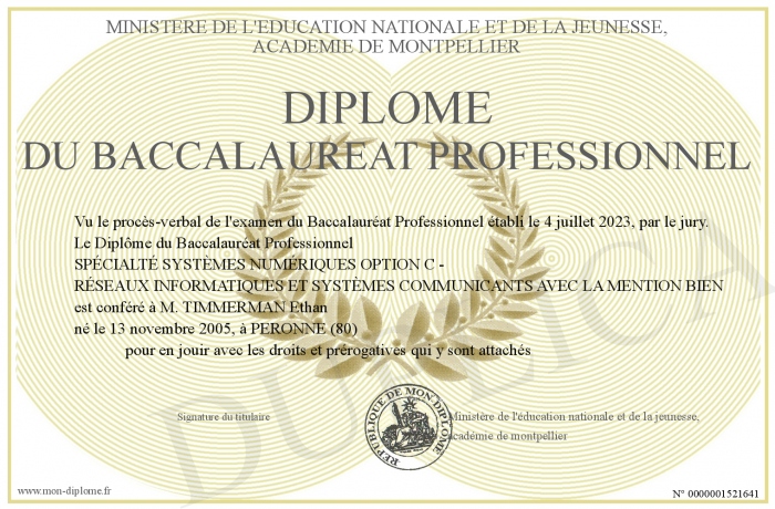 Envoyez par email votre Diplôme du baccalaureat PROFESSIONNEL personalisé