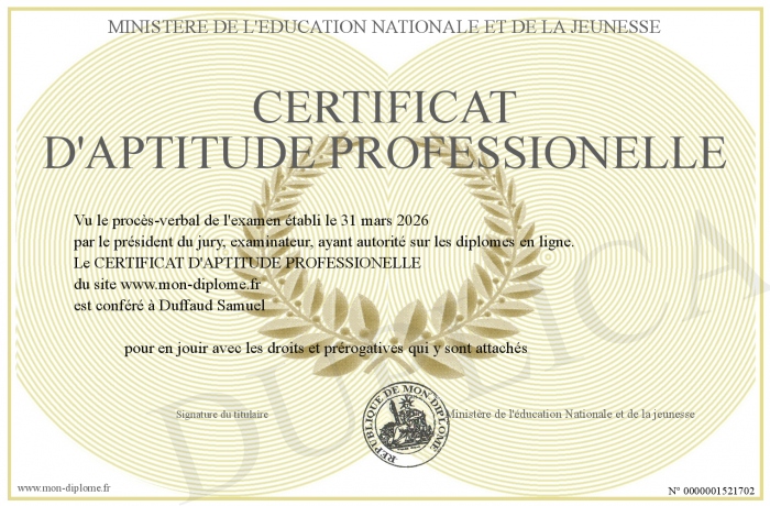 Envoyez par email votre CERTIFICAT D'APTITUDE PROFESSIONELLE personalisé