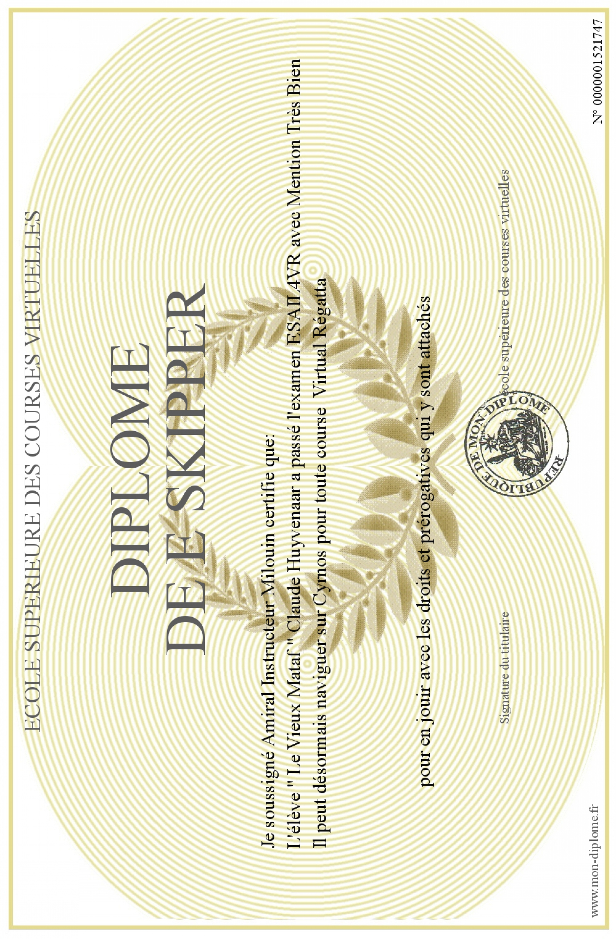 Envoyez par email votre Diplôme de e skipper personalisé