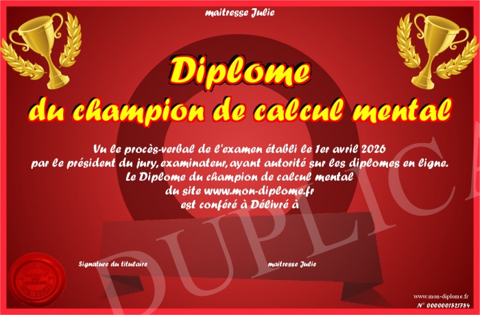 Envoyez par email votre Diplôme du champion de calcul mental personalisé