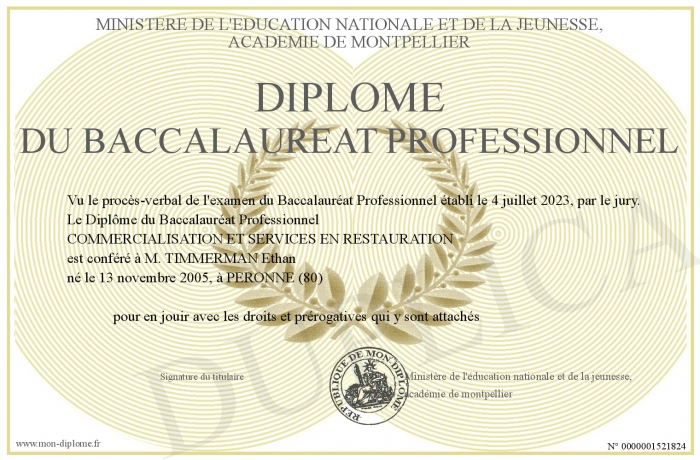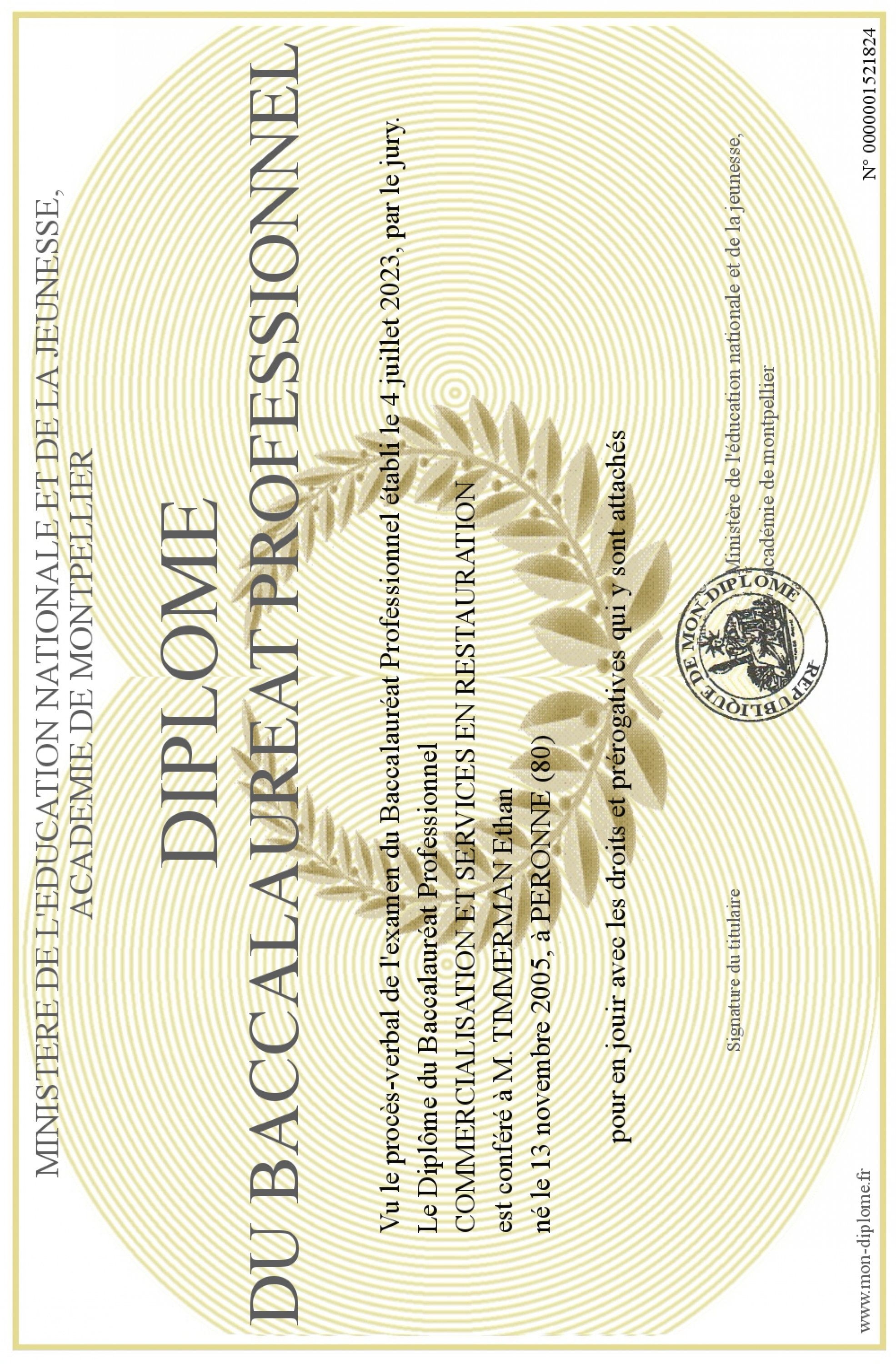 Envoyez par email votre Diplôme du baccalaureat PROFESSIONNEL personalisé