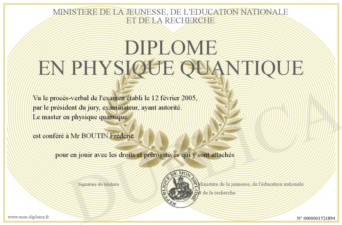 Envoyez par email votre Diplôme en physique quantique personalisé