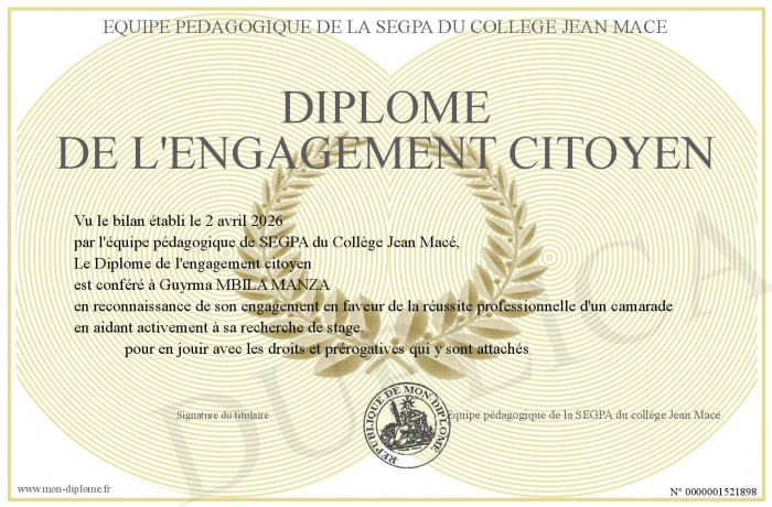 Envoyez par email votre Diplôme de l'engagement citoyen personalisé