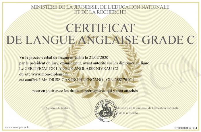 Envoyez par email votre CERTIFICAT DE LANGUE ANGLAISE GRADE C personalisé