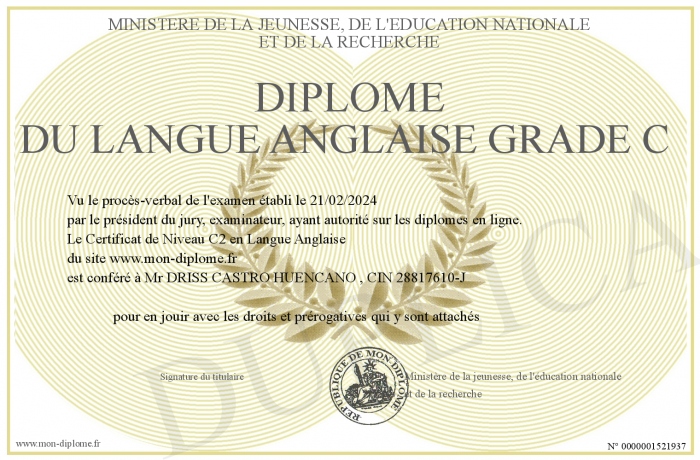 Envoyez par email votre Diplôme du Langue Anglaise Grade C personalisé