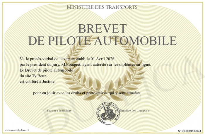 Envoyez par email votre Brevet de pilote automobile personalisé
