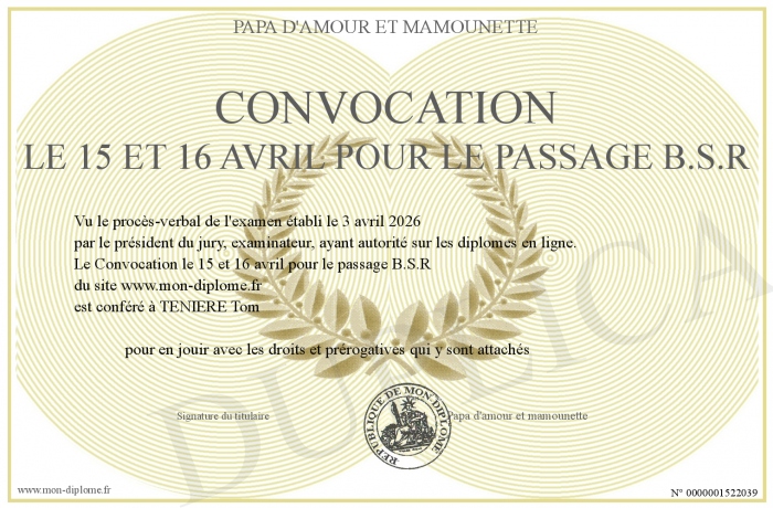 Envoyez par email votre Convocation le 15 et 16 avril pour le passage B.S.R personalisé