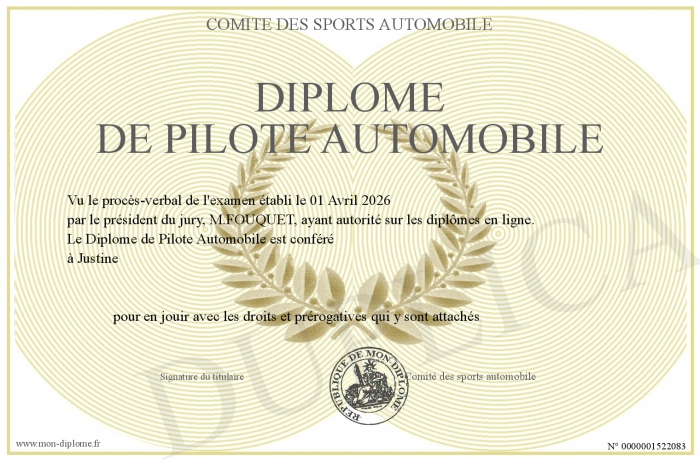 Envoyez par email votre Diplôme de Pilote Automobile personalisé