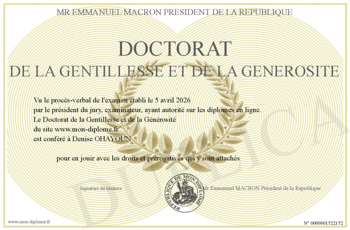 Envoyez par email votre Doctorat de la Gentillesse et de la Générosité personalisé