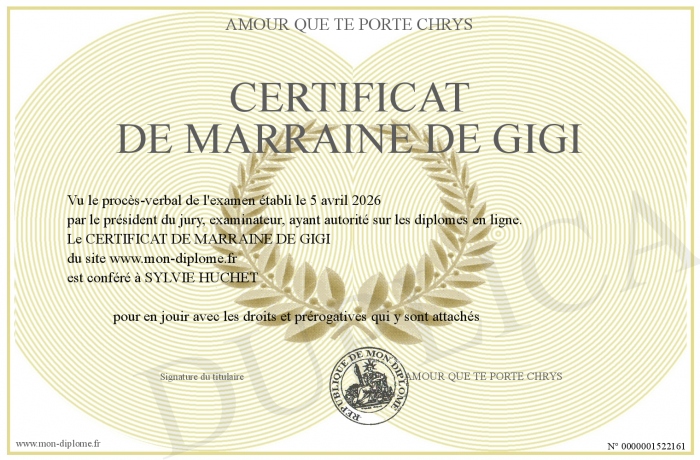 Envoyez par email votre CERTIFICAT DE MARRAINE DE GIGI personalisé