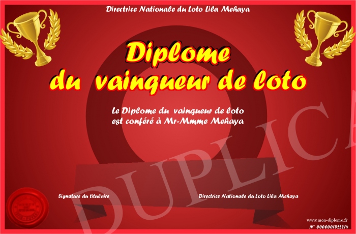 Envoyez par email votre Diplôme du vainqueur de loto personalisé