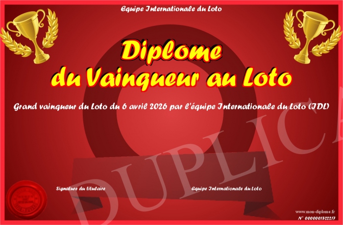Envoyez par email votre Diplôme du Vainqueur au Loto personalisé