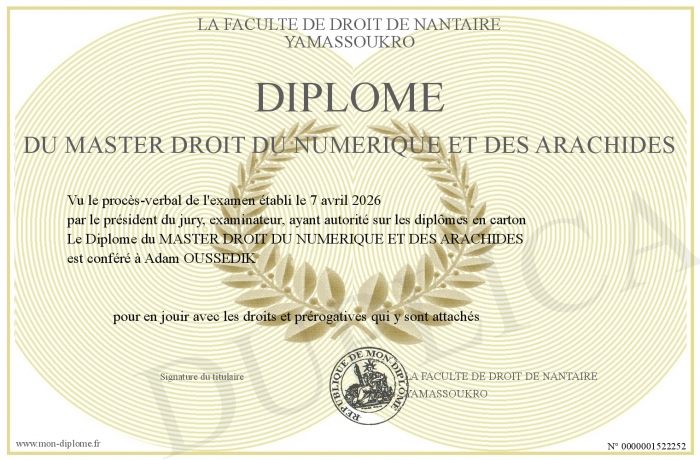 Envoyez par email votre Diplôme du MASTER DROIT DU NUMERIQUE ET DES ARACHIDES personalisé