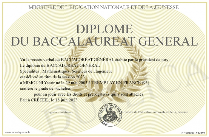 Envoyez par email votre Diplôme du baccalaureat général personalisé