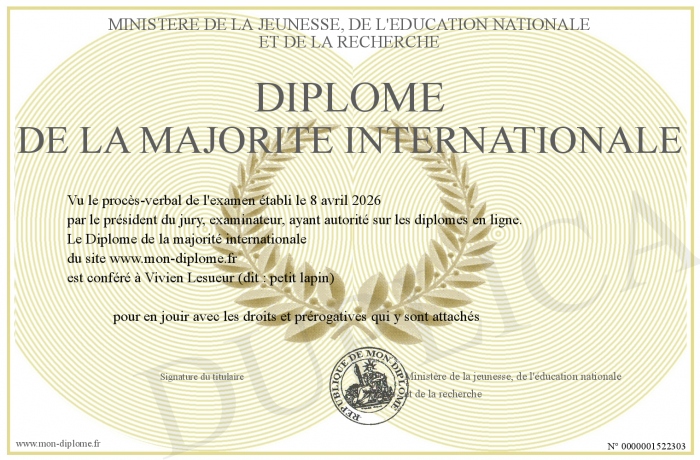 Envoyez par email votre Diplôme de la majorité internationale personalisé
