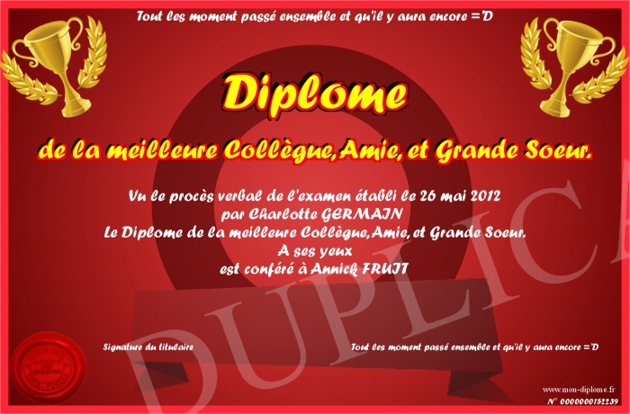 Envoyez par email votre Diplôme de la meilleure Collègue, Amie, et Grande Soeur. personalisé