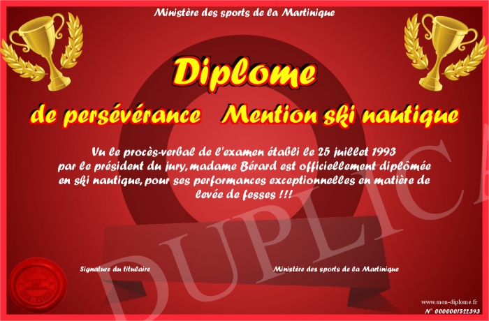 Envoyez par email votre Diplome de persévérance Mention ski nautique personalisé