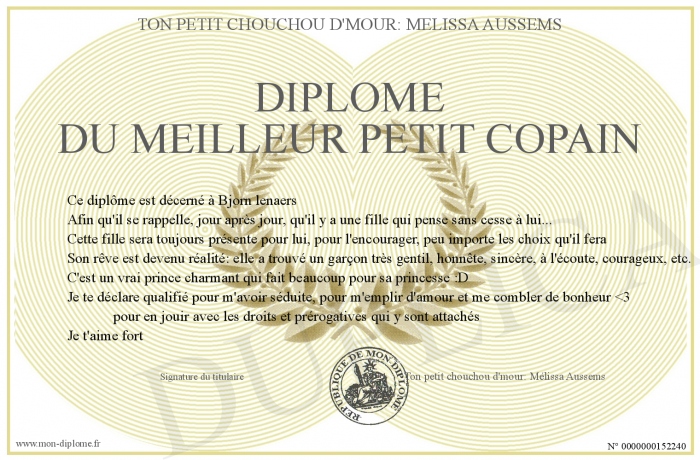 Envoyez par email votre Diplome du meilleur petit copain personalisé