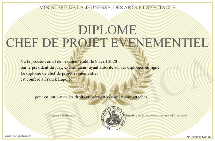 Envoyez par email votre Diplôme Chef de projet évènementiel personalisé