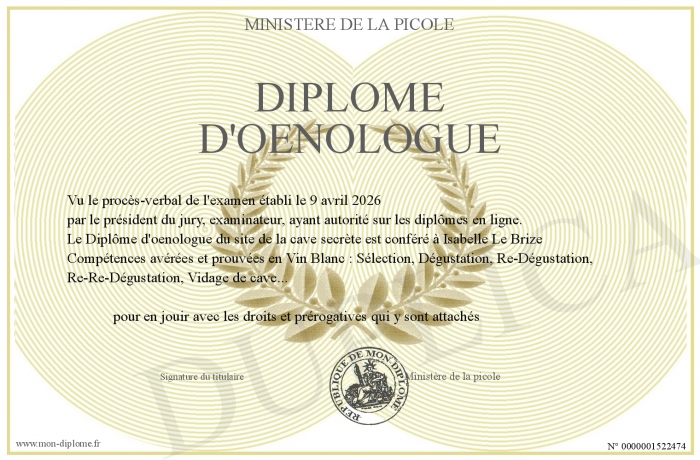 Envoyez par email votre Diplôme d'Oenologue personalisé