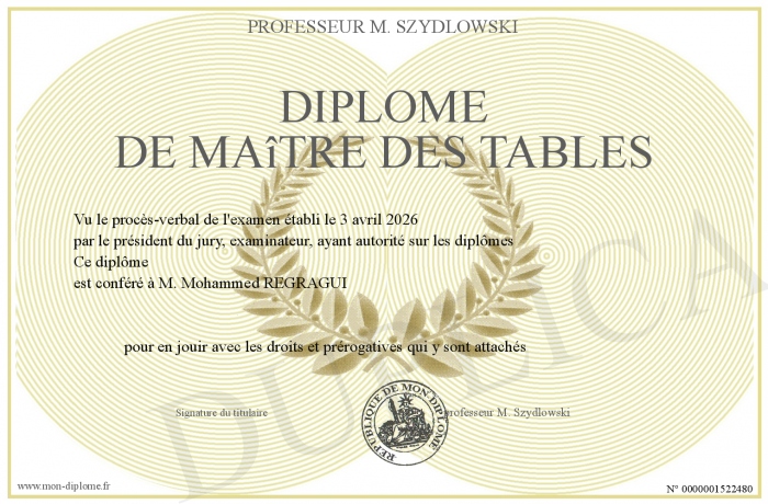 Envoyez par email votre diplôme de Maître des Tables personalisé