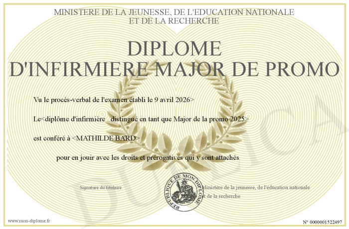 Envoyez par email votre Diplôme d'Infirmière Major de promo personalisé
