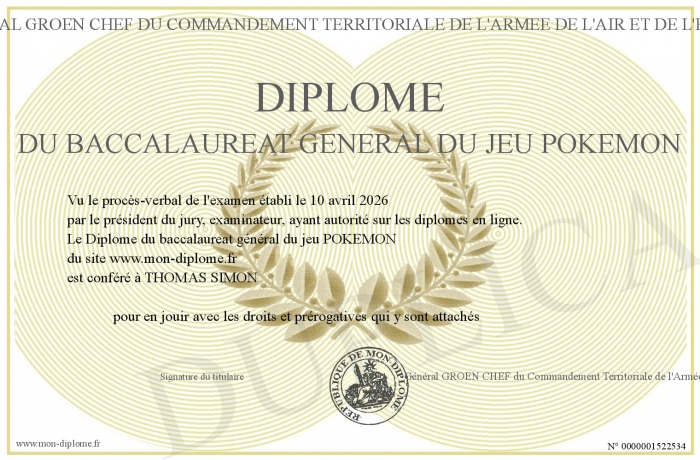 Envoyez par email votre Diplôme du baccalaureat général du jeu POKEMON personalisé