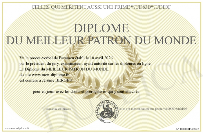 Envoyez par email votre Diplôme du MEILLEUR PATRON DU MONDE personalisé