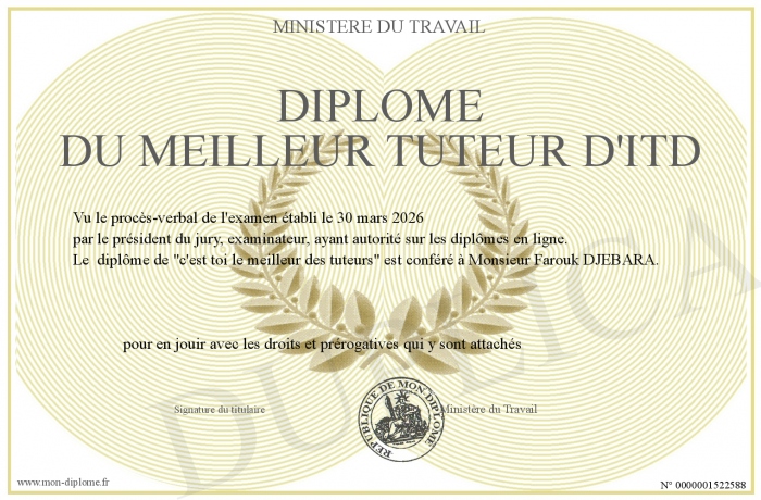 Envoyez par email votre Diplôme du meilleur tuteur d'ITD personalisé