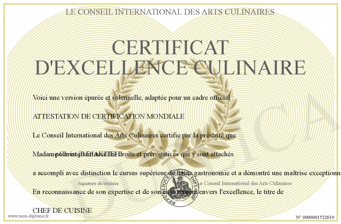 Envoyez par email votre CERTIFICAT D'EXCELLENCE CULINAIRE personalisé