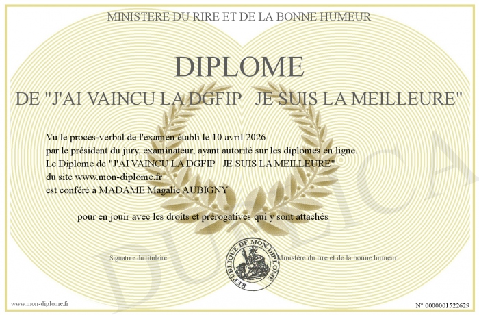 Envoyez par email votre Diplôme de -J'AI VAINCU LA DGFIP JE SUIS LA MEILLEURE- personalisé