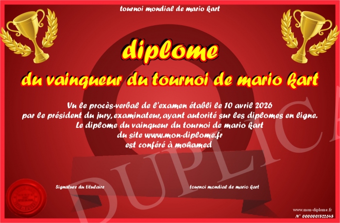 Envoyez par email votre diplome du vainqueur du tournoi de mario kart personalisé