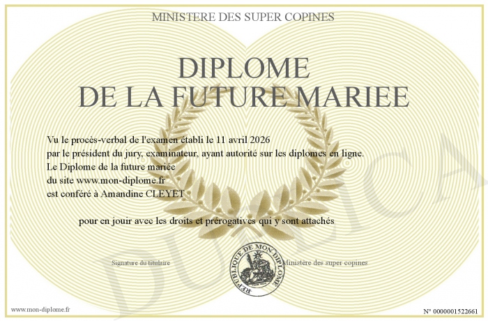 Envoyez par email votre Diplôme de la future mariée personalisé